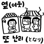 [고로] 옆은 또 난리다 한국어로 '옆'은 일본어로 'となり(tonari: 隣)'입니다. 옆집에서 부부싸움을 해요. 어제도 그러더니 오늘도... 또 난리예요. 이웃집 토토로는 'となりのトトロ' 'となり'를 쓰는 일본어로 가장 유명한 게 이웃집 토토로가 아닐까요? となりのトトロ(이웃집 토토로) となりのくに(이웃 나라) 처럼 となり는 한국어로 '이웃'이라는 뜻도 있어요. 토토로나 나라나 바로 옆에 붙어 있지는 않죠? 토토로면 나의 마음 옆, 나라면 바다는 있지만 가깝다는 뜻으로 쓰이죠? 그럴 때 'となり'를 써요. となりのせき(옆자리) 도 많이 써요. 'となりのせきの ますだくん(옆자리의 마스다군)' 일본에서 유명한 그림책이에요.